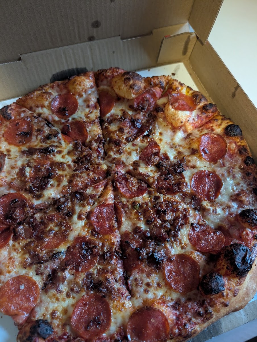 Food is excellent! The pizza was really good and perfectly cooked. The bread sticks are we're good and fluffy on the inside while the outside had a good but not burnt top. Definitely recommend eating here if you haven't yet. The staff we're great as always! Store is always clean. always being treated like family, what a great place to eat at.