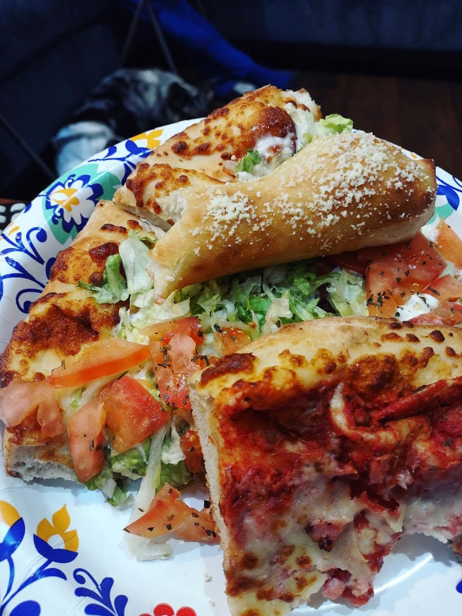 The pizza was great. The bread sticks were awesome! I loved the salad my wife didn't care for the mushrooms on the salad. On the food. The inside dining wasn't the best. You get paper plates and plastic forks. They were out of plastic knives. They were out of bottled water and the only diabetic friendly drinks they had is diet pepsi. The tables are too small for the boxes and the plates. The best option is takeout!